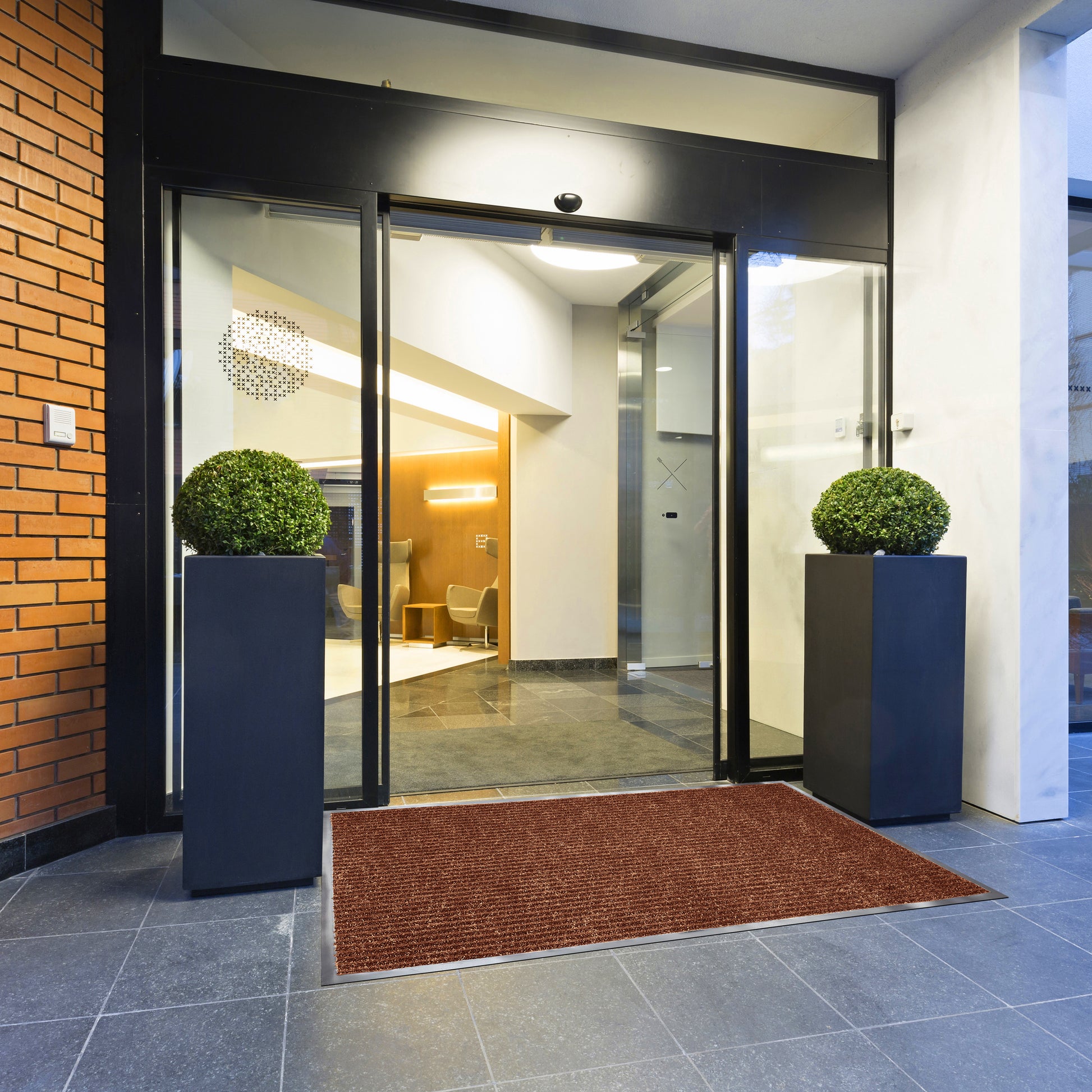 The Brush Rib Entrance Mat offers the high-fashion look of fine carpeting in a hi-lo rib pattern with outstanding durability for the toughest indoor or outdoor installations. Its surface scrapes dirt and grit off shoes while removing moisture simultaneously.